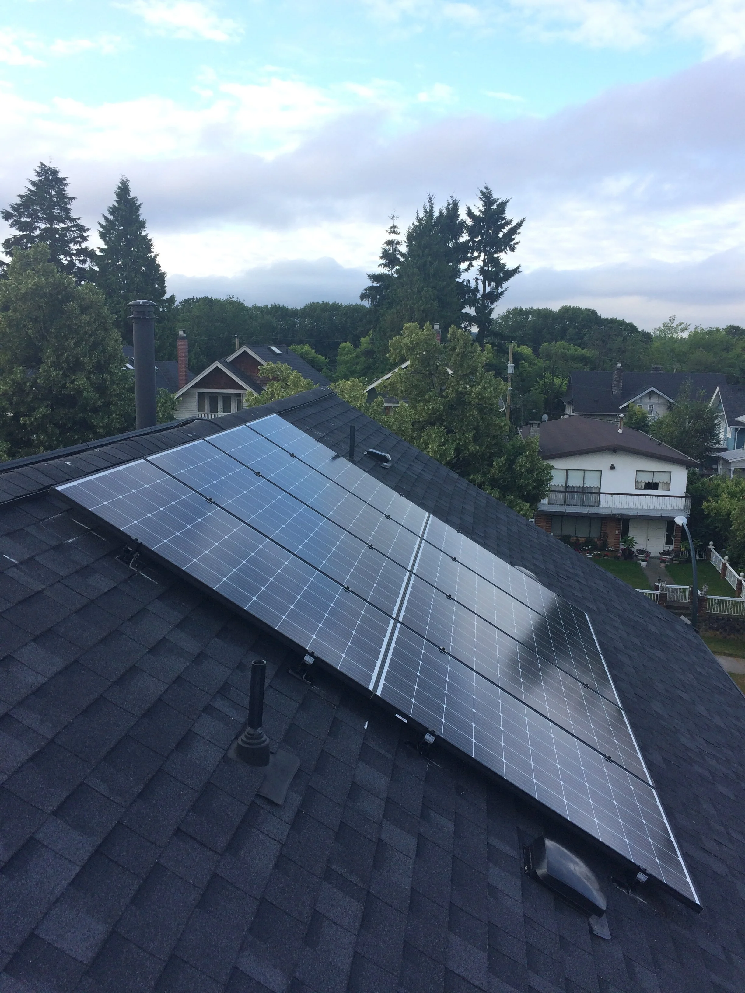 The City of Vancouver has tight rules and guidelines around installing solar energy systems onto roofs in Vancouver. For this project, we met with the Development & Building Team numerous times to ensure that the proposed racking was consistent with their wind load and maximum point load parameters. The solar system took two days to install and is split into two sections, 8 solar panels on the West-facing roof and 8 solar panels on the East-facing roof.